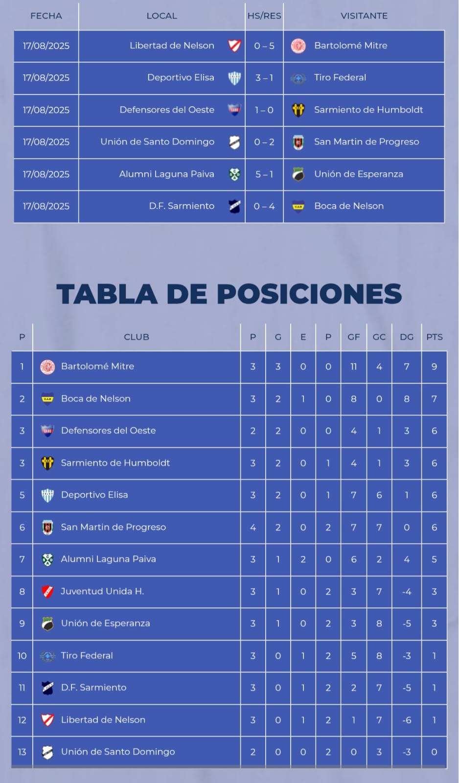 Posiciones: Mitre 9 puntos; Boca 7; Defensores del Oeste, Sarmiento (Humboldt) y Deportivo Elisa 6; Alumni 5; Unión (Esperanza), Juventud Unida (Humboldt) y San Martín de Progreso 3; Tiro Federal, DF Sarmiento y Libertad (Nelson) 1; Unión SD 0.